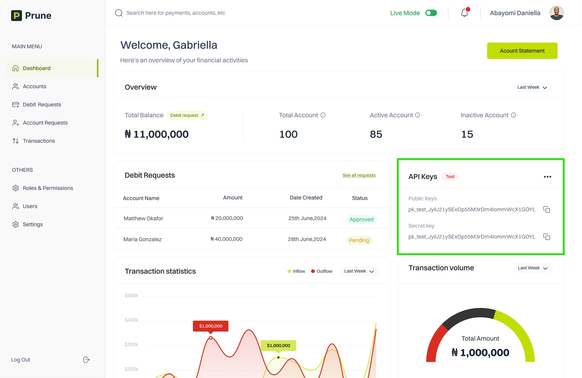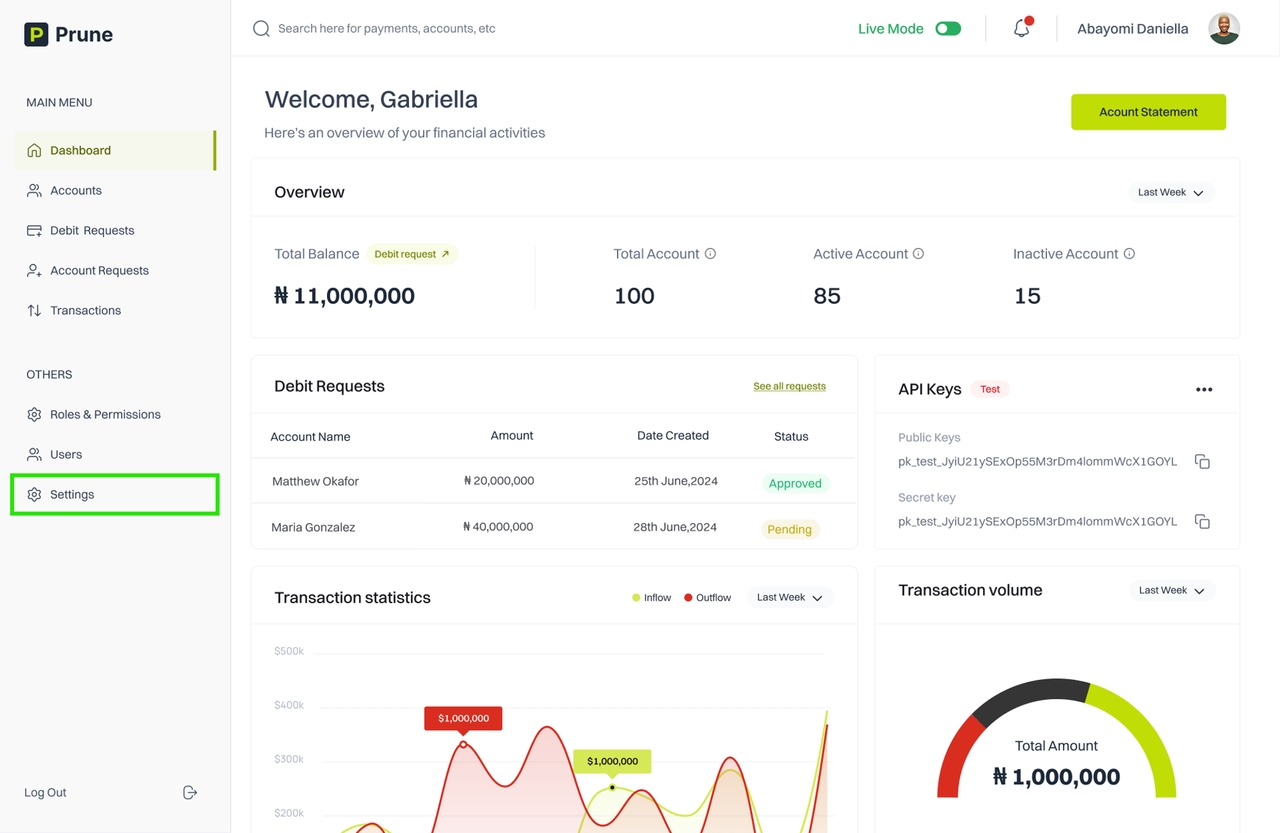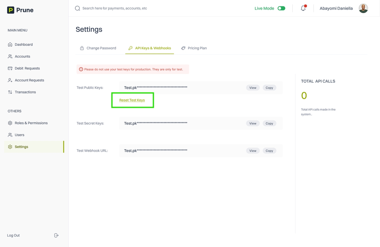 In this section, you will learn how to access and reset API keys. These keys are essential for authenticating your requests to the Prune API. The instructions provided below will guide you through each step, ensuring your keys are managed securely to prevent unauthorized access.