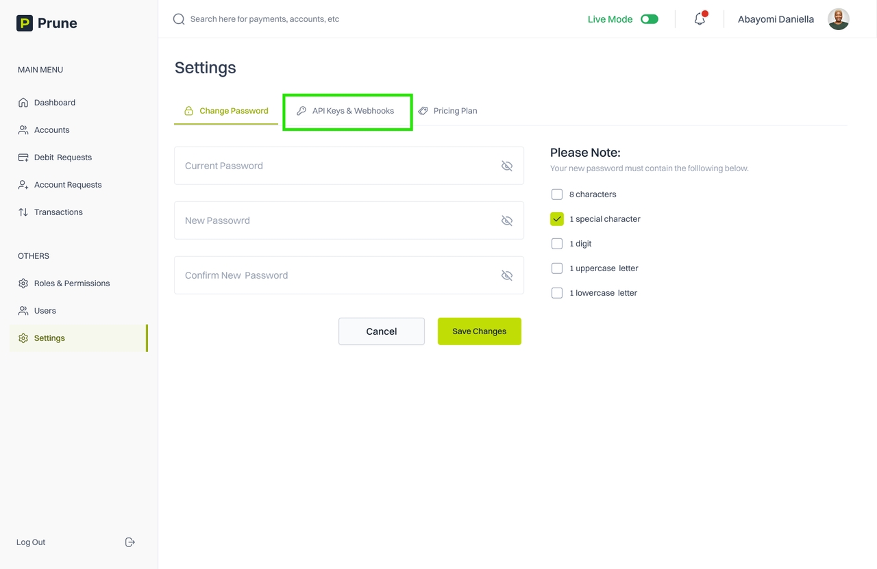 Navigate to the “API Keys & Webhooks” tab.